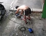 Un joven chino recibe una fuerte descarga eléctrica cuando se disponía a limpiar su pequeña motocicleta. ¿Salvó la vida?.