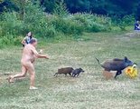 Captan el momento en que un nudista alemán persigue a un jabalí que le robó el portátil