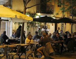 Un bar monta su terraza encima de un coche aparcado en la acera