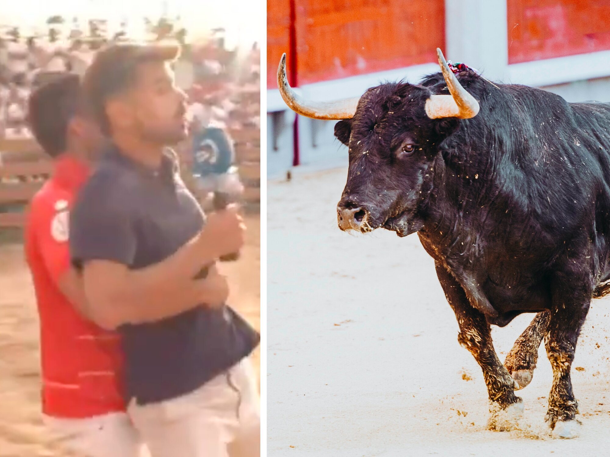 El programa 'Quédate' de la cadena autonómica vasca ETB2 este martes 26 de agosto envió a uno de sus reporteros a las fiestas que se celebran en Sesma, un municipio de Navarra. Xabier Eguía, el reportero, y sus compañeros de cámara se encontraban dentro del ruedo para la conexión en directo mientras se celebraba un evento taurino.