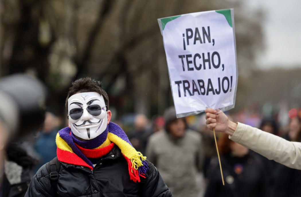 "Pan, techo y trabajo" es el lema de las Marchas de la Dignidad que, por segundo año consecutivo, han avanzado hacia la Plaza de Colón en Madrid desde todos los rincones de España. Un año más se han unido miles de personas para quejarse de la situación social, política y económica del país, pidiendo un cambio.