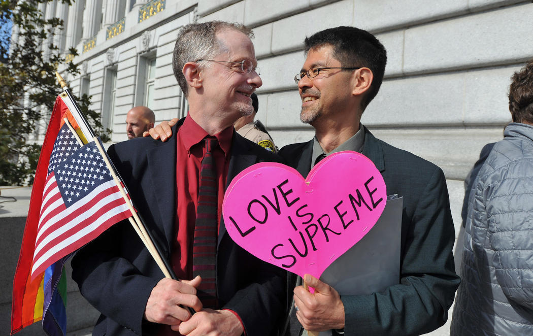 En la foto vemos a John Lewis y Stuart Gaffney, una pareja que lleva desde hace años luchando por tener el derehco al matrimonio, y ahora su sueño s eha hecho realidad gracias a esta decisión. Así, llevan este cartel que reza: "El amor se Supremo".