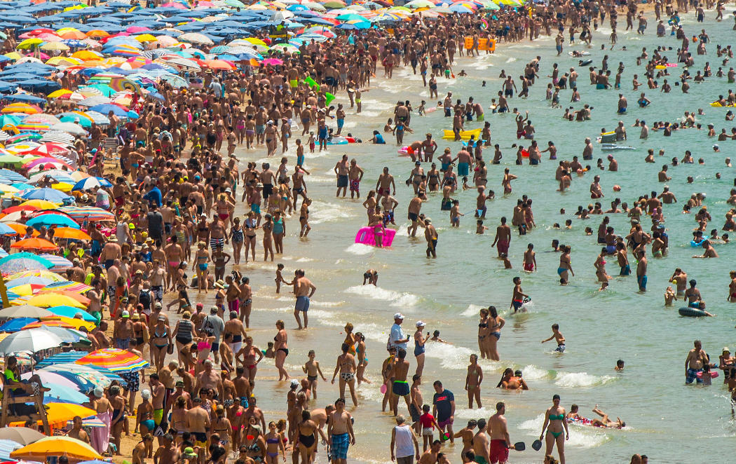Así lucía ayer una de las playas de Benidorm, una imagen que, si bien no es novedosa porque se trata de un emblemático destino turístico español, agobia sólo con verla. ¿Con cuántas horas de antelación habrá que colocar la hamaca y la sombrilla para tener sitio en primera línea de playa? ¿O en cualquier punto de la playa?