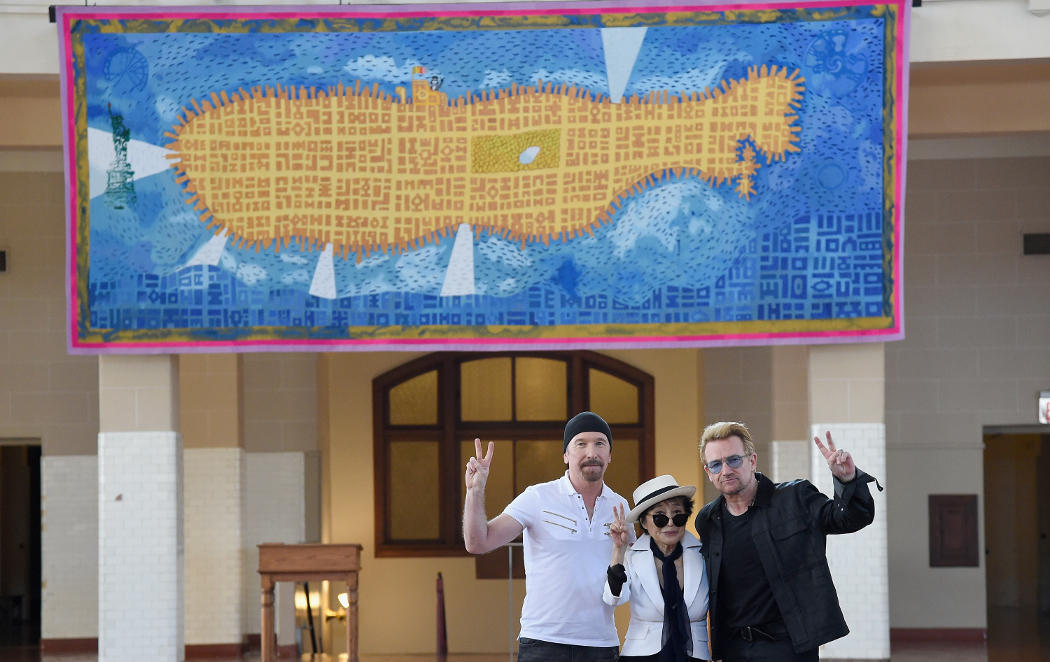 The Edge, Yoko Ono y Bono posan en la Isla de Ellis delante del tapiz que la ciudad de Nueva York ha colocado, y donde permanecerá, para recordar la figura deJohn Lennon. También, el alcande ha declarado el29 de julio como el Día de John Lennon en la ciudad.