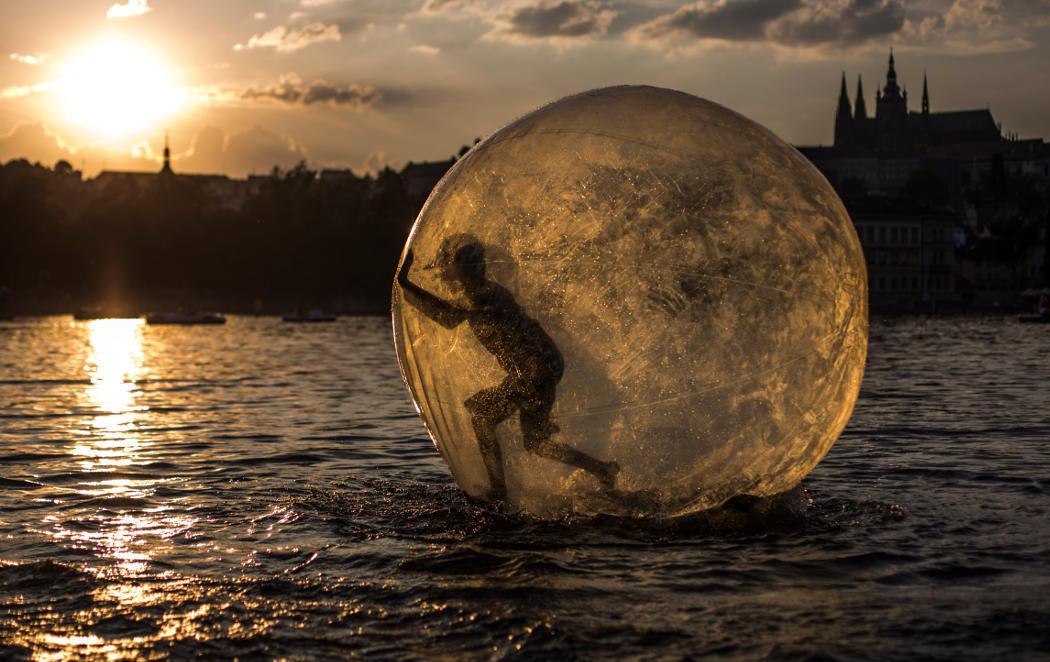 ¿Algunas vez habéis andado sobre las aguas en una esfera acuática? Un turista en anda sobre una en el río Vltava, en Praga. Eso sí, como haya viento o resaca, habrá que hacer buena pierna para que no te lleve lejos de la orilla.