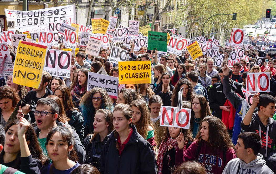 Los estudiantes protestan contra la implantación de la Ley Orgánica de Mejora de la Calidad Educativa, más conocida como Lomce o Ley Wert. La medida que más hace temblar a los actuales y futuros estudiantes es el modelo universitario 3+2, según el cual se implantarían grados de 3 años y másteres de 2. Como sabemos, actualmente las carreras (excepto alguna excepción) constan de 4 años, que se sigue de un año de máster, que es claramente opcionas, pero claro, con la competencia laboral que hay hoy en día te quedas un poco atrás sin completar esos 5 años mínimos de formación que había antes del modelo Bolonia.