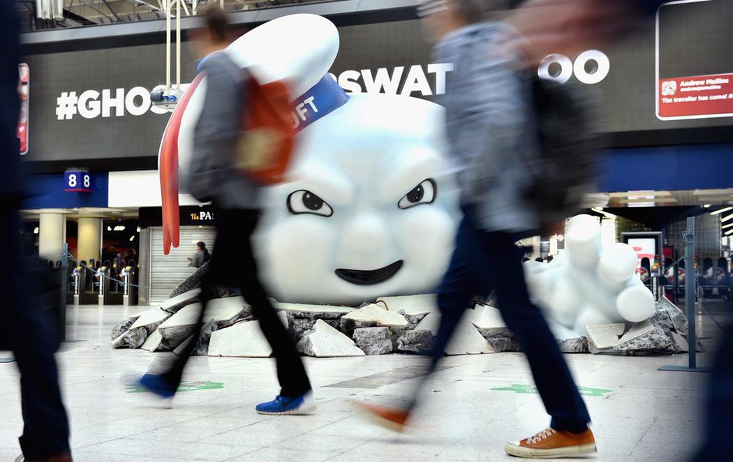 Así ha amanecido la estación londinense de Waterloo, situada muy cerca del Támesis. Un muñeco gigante del Hombre de Malvavisco ha "amenazado" con hacer acto de aparición a los viajeros de la terminal británica en uno de los actos de promoción de la nueva película de 'Cazafantasmas' que se estrenará en los cines españoles el próximo 12 de agosto.