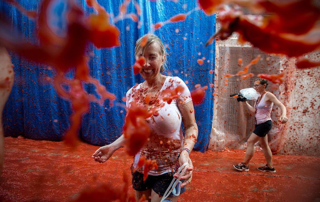 Protegidos por cualquier harapo viejo o con cascos hechos con cualquier material conseguido en casa, los turistas de distintos países como India, Rusia o Japón y los habitantes de la localidad se empezaron a lanzar tomates chafados como marcan las reglas de la fiesta poco antes de la pirotecnia lanzada poco antes de las 11 de la mañana. Tras una hora de batalla, otra pirotecnia marcó el final de la batalla de tomates con las calles del pueblo bañadas de rojo.