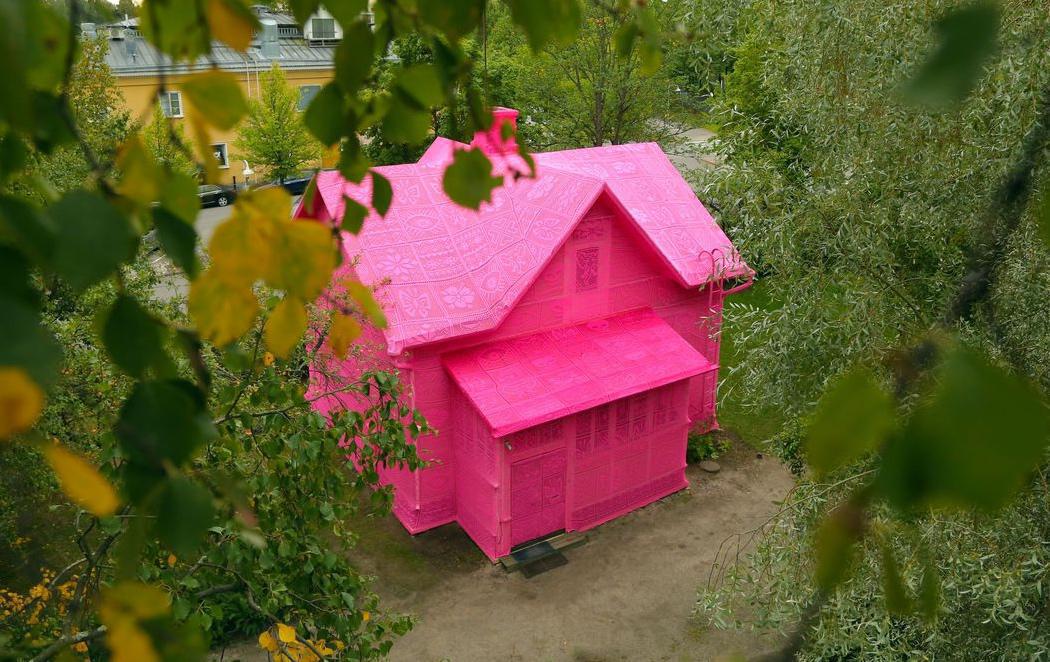 Durante tres semanas de trabajo, se juntaron Olek, las mujeres refugiadas, más voluntarias de un centro de acogida y un grupo profesional de Polonia para crear 300 metros cuadrados de ganchillo rosa que terminaron cubriendo la casa situada en Kerava, Finlandia, desde el tejado hasta la base. Ambas casas estarán en funcionamiento hasta invierno.