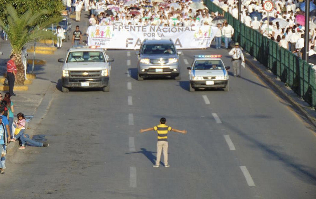 Desde México nos llega una de las fotos más potentes del verano. Un niño, solo, en una carretera y frente a él una multitud congregada para manifestarse a favor de la familia tradicional: hombre, mujer e hijos. Esto es, una manifestación en contra del matrimonio igualitario para personas del mismo sexo.