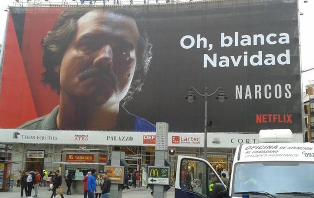 Debajo del emblemático cartel de 'Tío Pepe', Netflix ha colocado un enorme póster con el rostro del actor Wagner Moura, que da vida al narcotraficante Pablo Escobar, acompañado de la frase "Oh, blanca Navidad", para promocionar su serie estrella, 'Narcos'. Para quien no lo sepa, la blanca Navidad hace referencia al imperio de cocaína que erigió el peligroso colombiano.