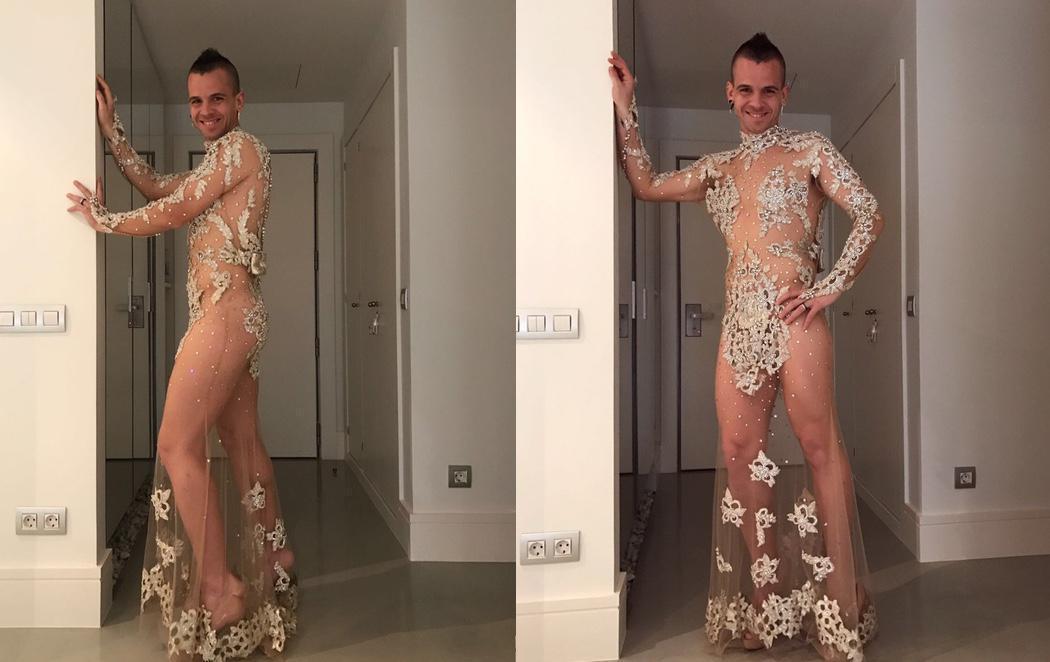 Ya es el segundo año que Dabiz Muñoz se pone el vestido de su mujer: el primer año se atrevió a ponerse el traje negro semitransparente que dejaba poco a la imaginación. Y este año tiene más mérito, porque el vestido blanco del año pasado es bastante ajustado. Pero el chef consigue que le entre a la perfección. Y, como su esposa, demuestra que no le da ninguna vergüenza dejar carne al descubierto.