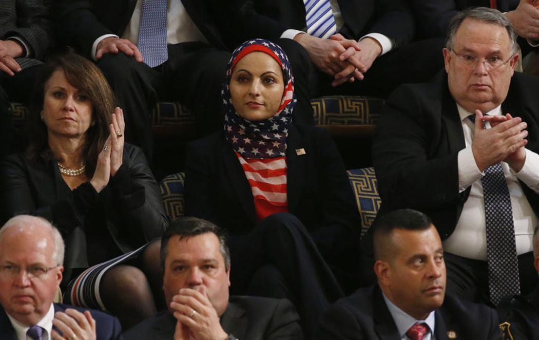 Durante su alocución, no faltaron las personas que quisieron mostrar su discrepancia ante el presidente. Por ejemplo, una mujer acudió con un velo islámico que representaba los colores de la bandera de Estados Unidos. Todo un desafío para un presidente que ha intentado vetar la entrada al país a todos los ciudadanos de siete países de mayoría islámica.