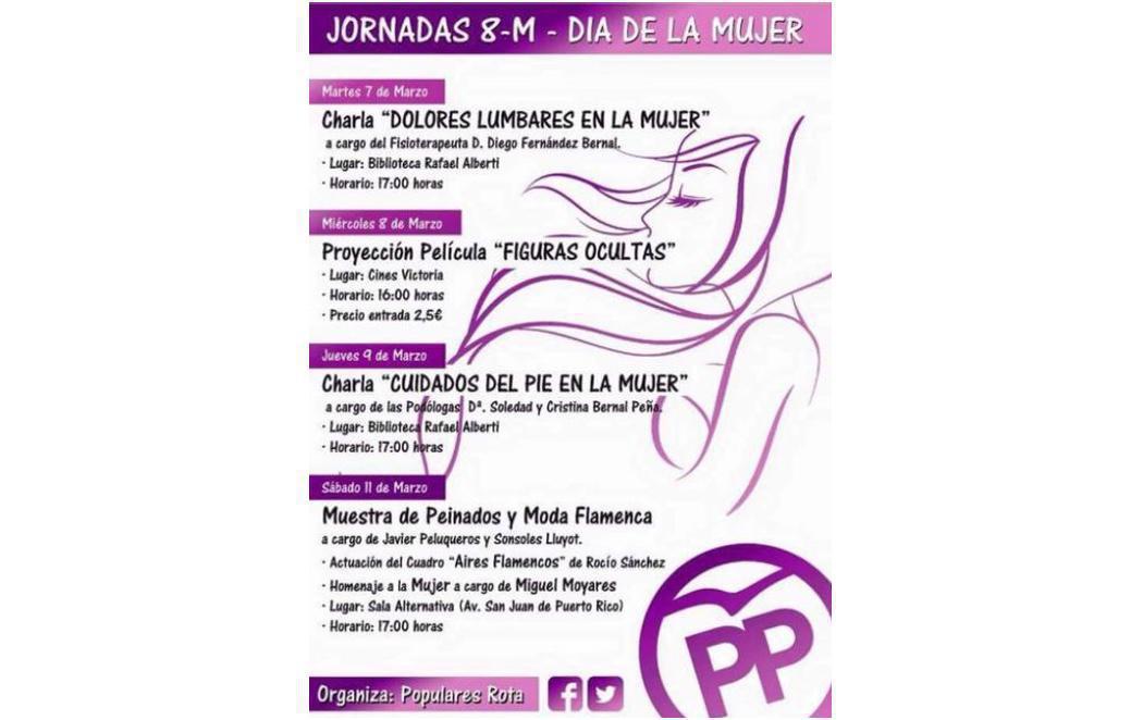 La última polémica ha saltado por el tipo de actos que ha programado el PP de Rota para la celebración de tal fecha: una charla sobre "dolores lumbares en la mujer", otro sobre "cuidados del pie" y una "muestra de peinados y moda flamenca".