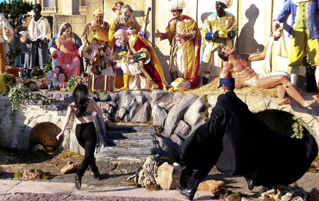 La Navidad da para ver muchas imágenes curiosas, y una de ellas la ha protagonizado el grupo feminista Femen. Ocurría en el Día de Navidad, y la activista Alisa Vinogradova se acercaba al grito de "¡Dios es mujer!"a un enorme Belén hecho con figuras a tamaño real, en El Vaticano. Como es propio de este grupo fundado en Ucrania, la mujer lo hacía con el torso desnudo y esas mismas palabras pintadas en él. Se entiende que su intención era coger la figura del Niño Jesús, aunque fue detenida antes de que eso ocurriera, y en la página web no han comentado la razón de este acto. Lo que sí han explicado es que la Vírgen María también se unía a la campaña #MeToo para "romper su silencio" bajo esta acción. Quizá porque en verdad quedó embarazada por haber sido elegida por Dios y casi sin preguntar.