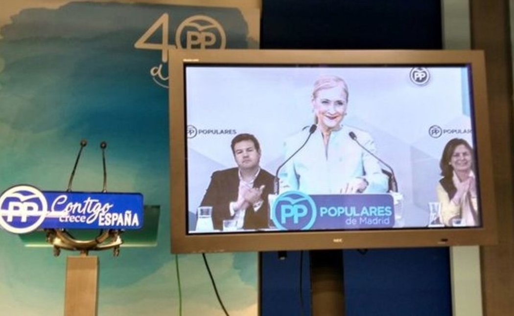 Sus palabras han llegado a la prensa a través de la retransmisión de un acto de su partido a través de un plasma, una imagen mítica que ahora podemos rememorar. Con este gesto, la líder del PP madrileño consigue evitar las preguntas de los periodistas, en el momento más complicado de su carrera política.