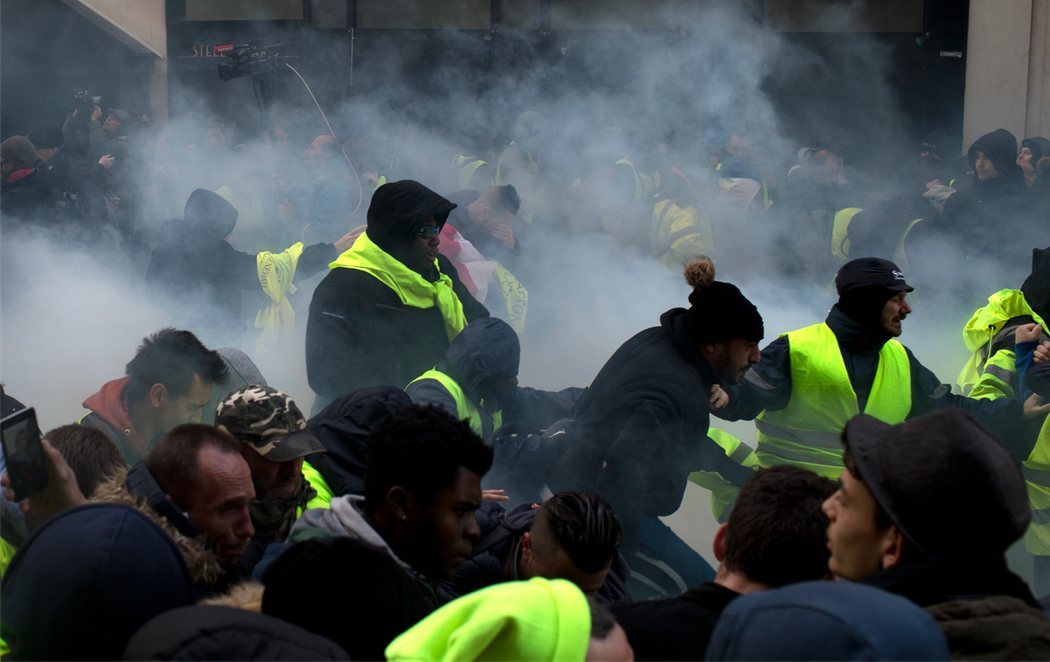 Los principales disturbios se han producido en los grandes bulevares, donde poco después de las 13:00 horas grupos de manifestantes formaron barricadas con material que se llevaron de algunos establecimientos próximos y con mobiliario urbano, antes de prenderle fuego. Los agentes antidisturbios utilizaron vehículos con mangueras de agua a presión y lanzaron gases lacrimógenos para hacer retroceder a los autores de los altercados. Al mismo tiempo, en la avenida de los Campos Elíseos, algunos "chalecos amarillos" incendiaron papeleras y contenedores, a lo que la policía respondió desplazando a los manifestantes y con algunos arrestos esporádicos. Por primera vez en más de una década, se han podido ver en París vehículos blindados de la gendarmería, desplegados para proteger los edificios públicos y despejar las barricadas.