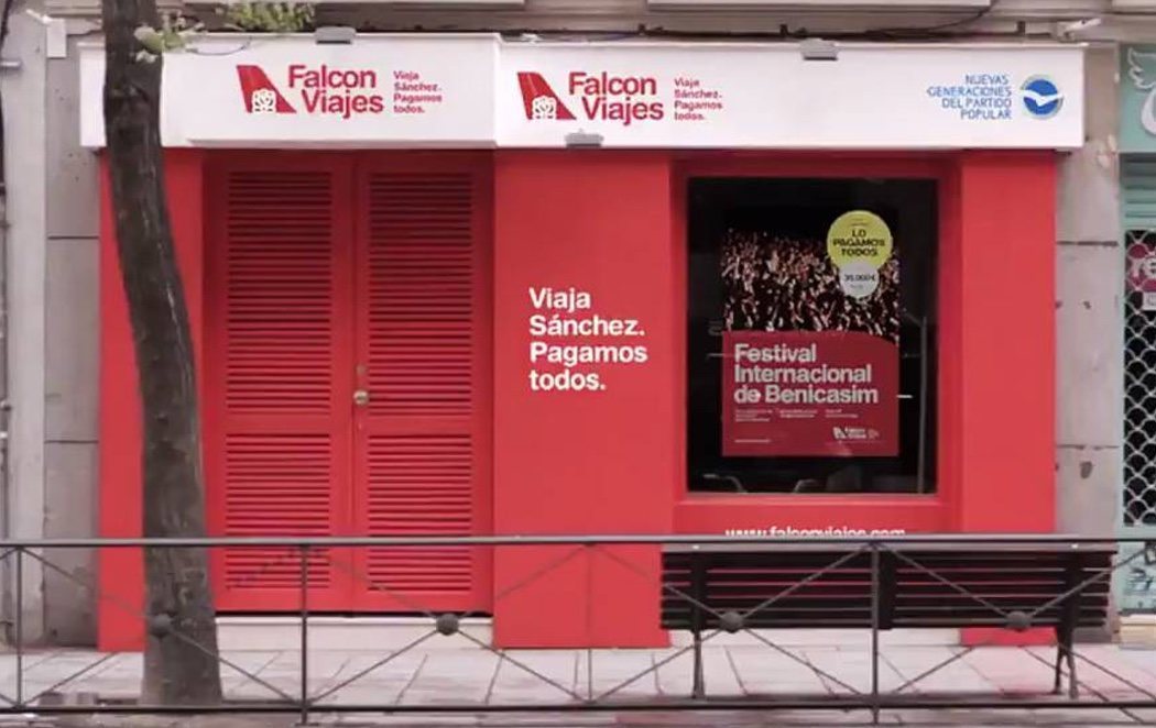 El establecimiento simula una agencia de viajes donde se ofertan todos los vuelos que el presidente del Gobierno ha realizado durante su etapa al frente del Ejecutivo. En los carteles se ofertan dos tarifas: la de la "gente de a pie", con viajes al Festival de Benicassim por 35.000 euros; y la de Sánchez, fijada siempre en cero euros. La campaña también incluye una página web con un buscador de vuelos en el que se muestran las tarifas con el formato mencionado.