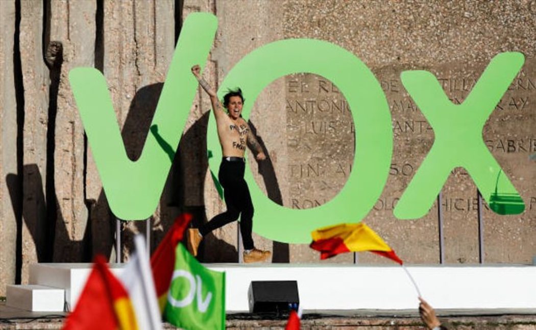 Al menos tres activistas de Femen con el pecho al descubierto han irrumpido el viernes 26 de abril en el escenario en el que VOX celebró el acto de cierre de campaña electoral en la plaza de Colón de Madrid.