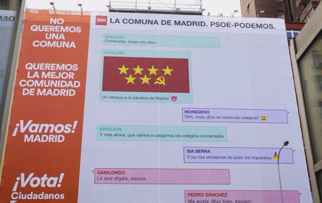 Como ya han hecho anteriormente, el partido ha simulado una conversación de WhatsApp entre Íñigo Errejón, Juan Carlos Monedero, Isabel Serra, Ángel Gabilondo y Pedro Sánchez bajo el título "La comuna de Madrid PSOE-Podemos". En el cartel, el candidato de Más Madrid a la Comunidad propone cambiar la bandera de Madrid por otra "más molona", en la que cambia el blanco por el amarillo en las estrellas y cambia una de ellas la convierten en la hoz y el martillo.