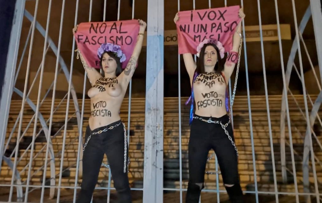 Ante esta concentració de la extrema derecha, cuatro activistas del movimiento feminista Femen se han encadenado a las rejas del Palacio de Vistalegre para expresar su rechazo a la ideología "fascista, racista y homófoba" de VOX. "Cadena feminista contra el foto fascista", podía leerse en su pecho descubierto.