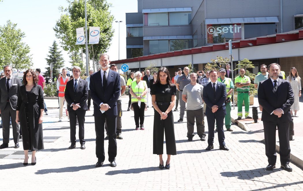 Los reyes han recordado a los fallecidos por la pandemia al inicio de su visita al Centro de Transportes de Coslada (CTC), donde han estado acompañados por el ministro de Transportes, Movilidad y Agenda Urbana, José Luis Ábalos, y la presidenta de la Comunidad de Madrid, Isabel Díaz Ayuso, todos vestidos de negro en señal de duelo.
