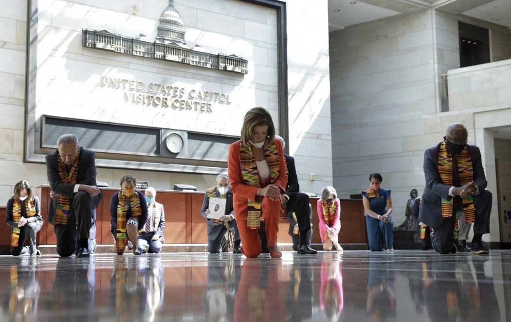 A la presidenta de la Cámara de Representantes, Nancy Pelosi, y al líder de la minoría demócrata en el Senado, Chuck Schumer, se sumaron casi 20 congresistas más en el Salón de la Emancipación, llamado así en homenaje a los esclavos que construyeron el Capitolio en el siglo XVIII. Estuvieron durante casi nueve minutos en silencio, tiempo que un policía estuvo asfixiando a Floyd con su rodilla el 25 de mayo en Minneapolis.