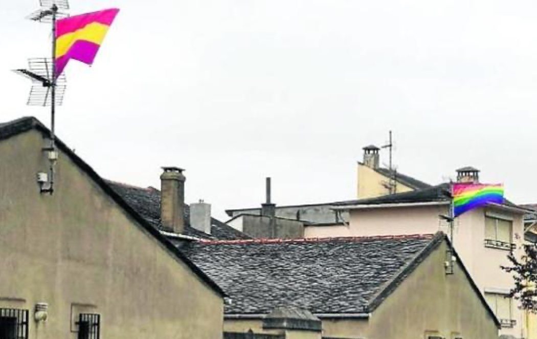 La casa familiar de Javier Ortega Smith en Figueras (Asturias) ha amanecido con banderas republicanas, arcoíris y otra de Gibraltar (donde él está vetado por un incidente) sobre el tejado.