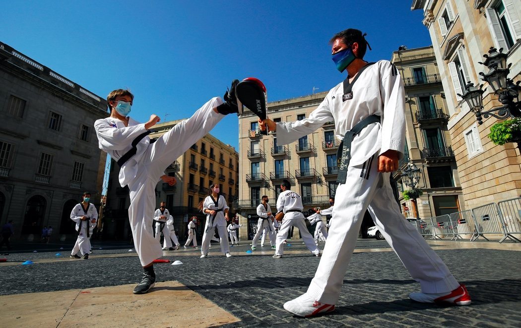 Los manifestantes han realizado una exhibición de Taekwondo con la que han pretendido demostrar la posibilidad de mantener todas las precauciones durante la práctica de este tipo de deportes.