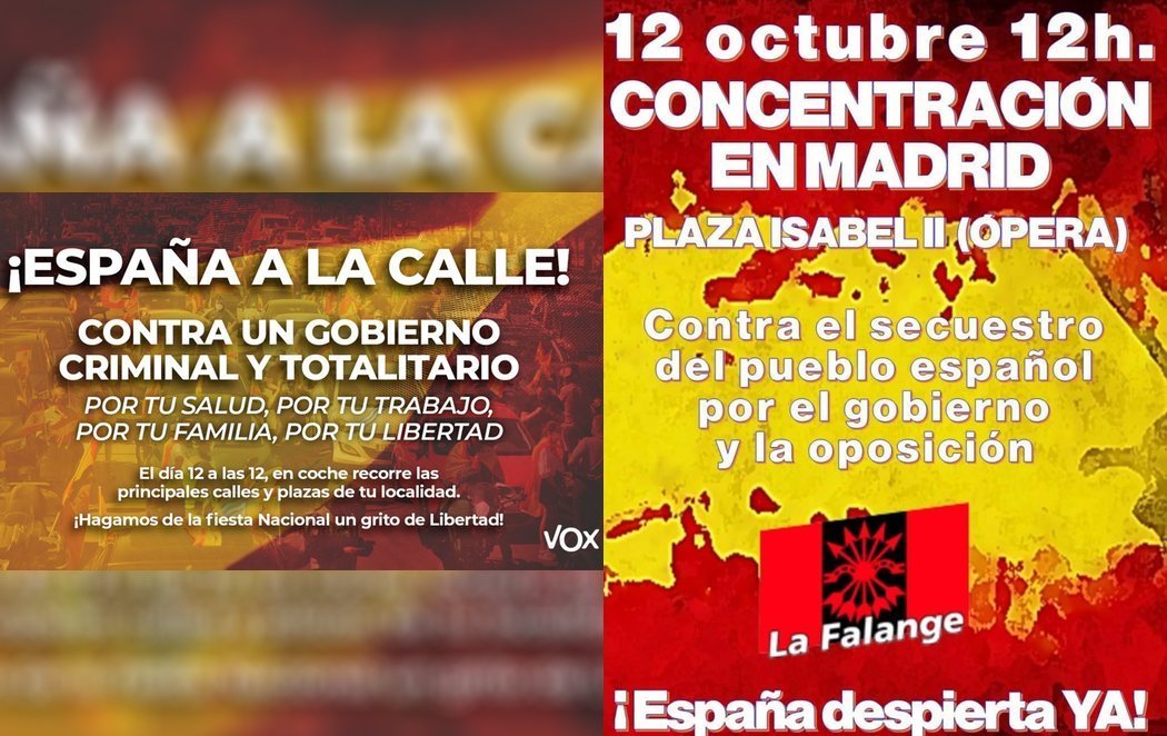A VOX se ha sumado La Falange, convocando también una manifestación el próximo 12 de octubre, Día de la Hispanidad, para protestar contra "el secuestro del pueblo Español por parte del Gobierno y la oposición". El partido franquista llevará a cabo la concentración en la madrileña plaza de Isabel II, más conocida como Ópera.