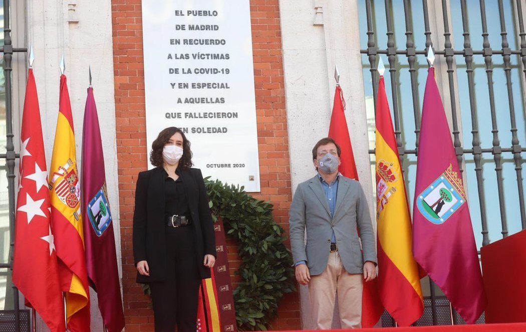 Se ha descubierto una placa en la fachada principal del edificio de la Real Casa de Correos, sede del Gobierno regional, y se ha depositado una corona de laurel en memoria de todos los fallecidos por coronavirus.