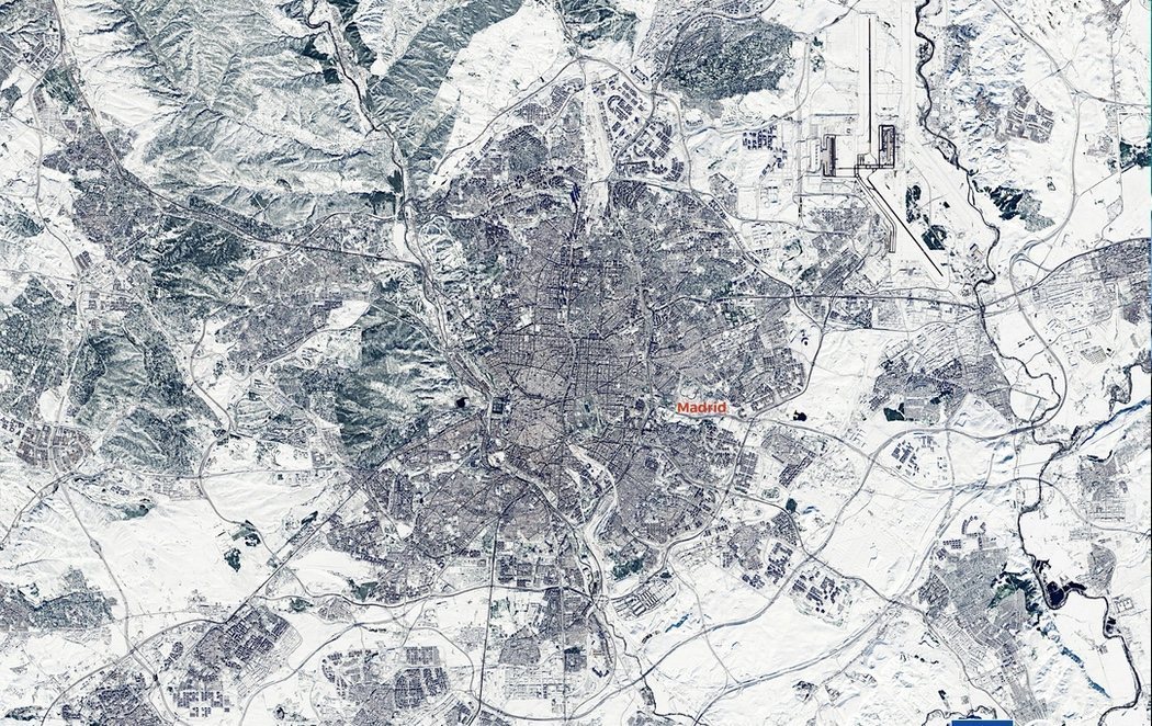 Además de la ciudad de Madrid bajo la nieve, en las instantáneas obtenidas por el satélite se puede ver el aeropuerto Adolfo Suárez Madrid-Barajas completamente nevado; así como las poblaciones situadas en el cinturón metropolitano de la capital, como Fuenlabrada, Getafe o Parla.