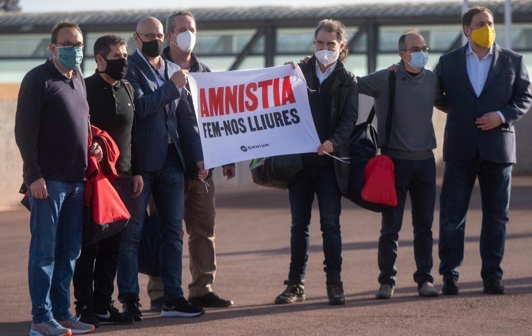 Los siete presos del procés que cumplen condena en la cárcel barcelonesa de Lledoners han salido de prisión mostrando una pancarta a favor de la amnistía, después de que la Generalitat les concediera el tercer grado, coincidiendo con el inicio de la campaña electoral del 14F.