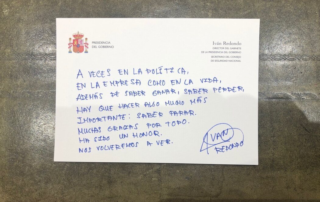 "A veces en la política, en la empresa como en la vida, además de saber ganar, saber perder, hay que hacer algo mucho más importante: saber parar. Muchas gracias por todo. Ha sido un honor. Nos volveremos a ver", ha escrito en una carta dirigida a sus colaboradores, con membrete del Director de Gabinete de Presidencia del Gobierno.