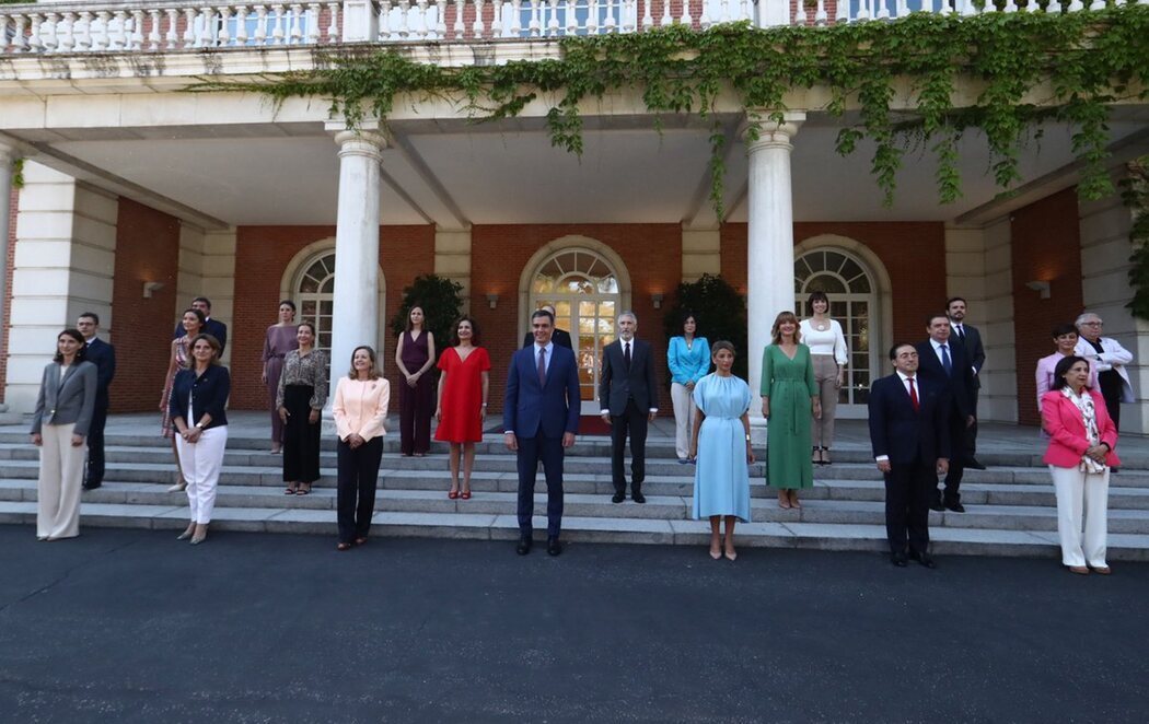 Pedro Sánchez y los 22 miembros de su Gabinete se han fotografiado en el Palacio de la Moncloa para la tradicional foto de familia del nuevo Gobierno. El paseíllo de los nuevos cargos lo ha iniciado la nueva vicepresidenta primera y ministra de Asuntos Económicos y Transformación Digital, Nadia Calviño. Tras ella, la vicepresidenta segunda y ministra de Trabajo y Economía Social, Yolanda Díaz. Le ha seguido la tercera vicepresidenta y ministra para la Transición Ecológica y el Reto Demográfico, Teresa Ribera.