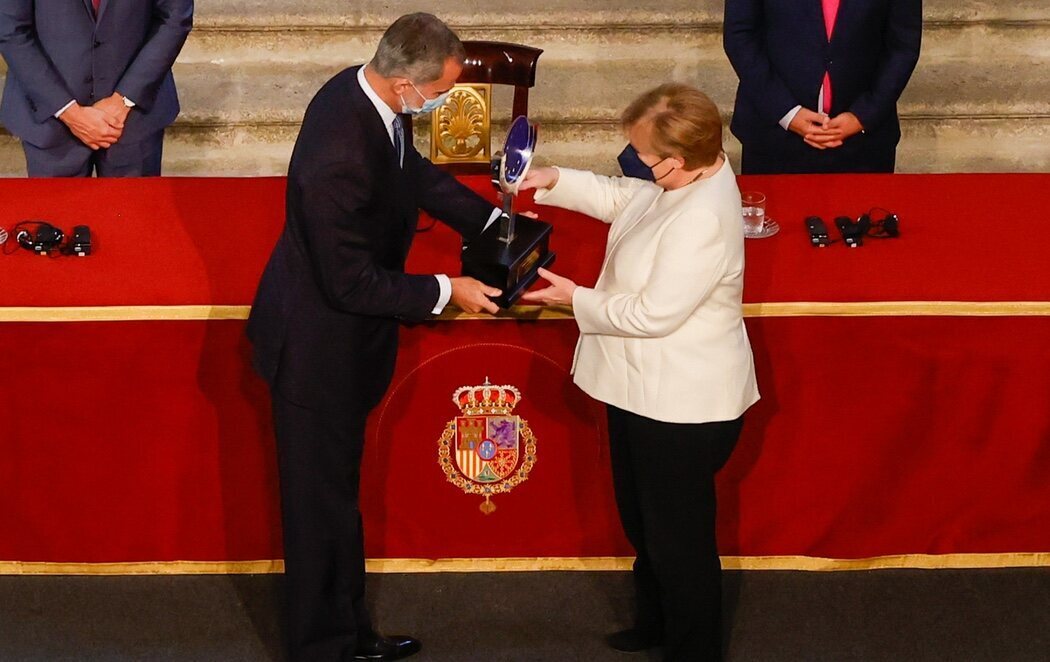 Merkel ha recibido el Premio Carlos V, cuyo objetivo es reconocer a personalidades, iniciativas, instituciones y proyectos que han destacado por su compromiso a favor de la Unión Europea o su contribución al engrandecimiento de los valores culturales, científicos o históricos del Viejo Continente.