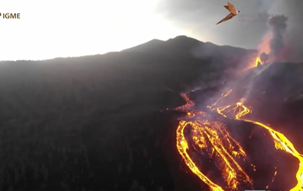 Las imágenes aéreas permiten la aproximación al cono secundario y permite captar la emisión constante de lava en primer término, con un fondo de fumarolas blancas junto a una densa columna de ceniza y piroclastos.