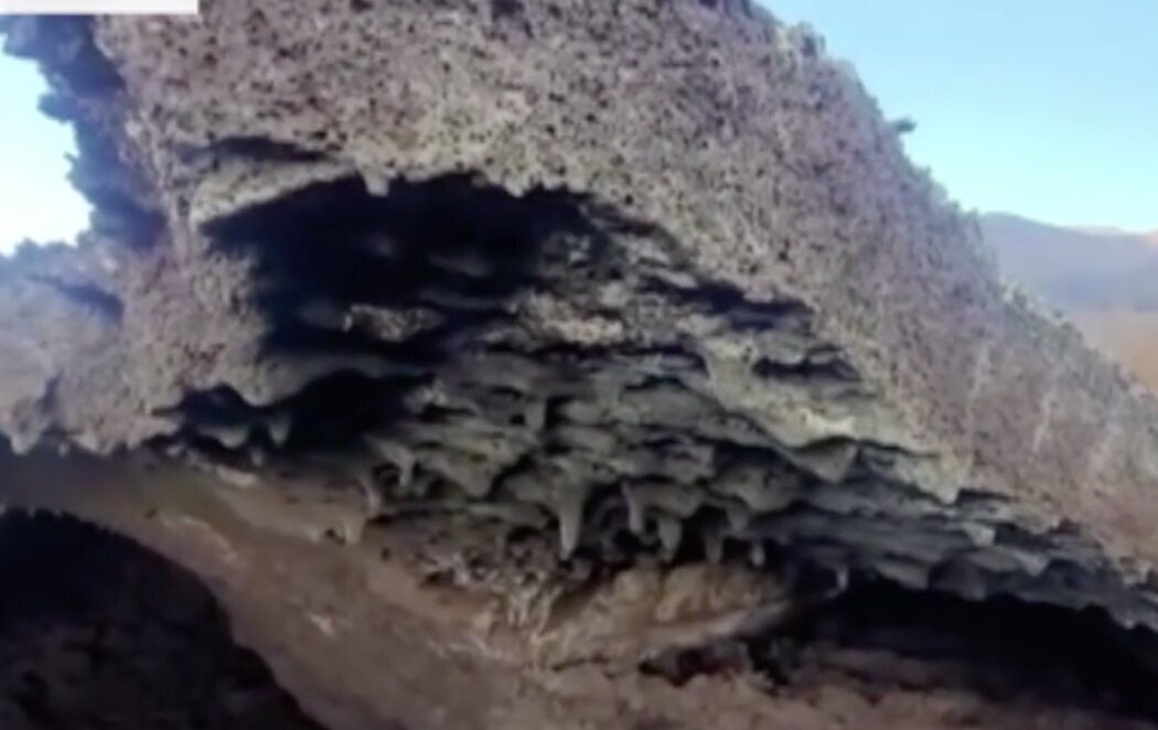 Por estos tubos circulaba la lava bajo tierra. Ahora vemos cómo esa lava ha creado 'estafilitos'. Son racimos de piedra, estalactitas creadas por las gotas de lava al caer del techo. La zona sigue siendo muy peligrosa. El techo de estas cuevas volcánicas de tan sólo cinco centímetros podría desplomarse con el peso de una persona.