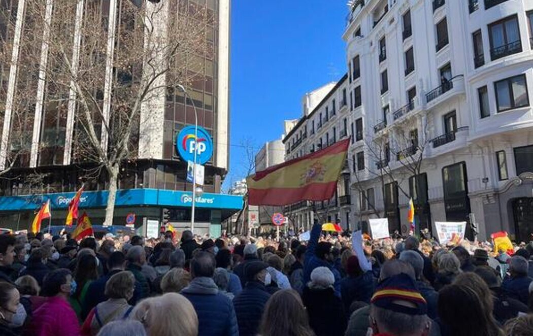La movilización ha arrancado poco antes de las 12:00 horas entre multitud de banderas de España. Entre los reclamos, los manifestantes piden también la dimisión del secretario general del PP, Teodoro García Egea.
