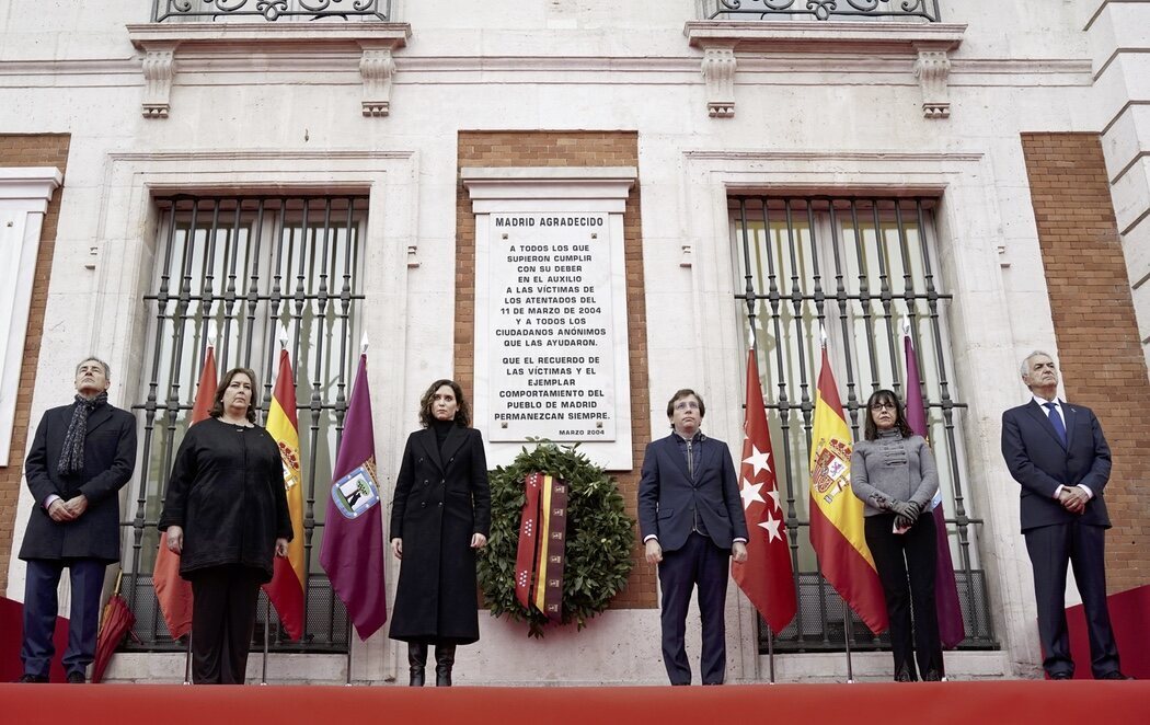 En el primero de los actos, ha estado presente la presidenta regional, Isabel Díaz Ayuso, junto al alcalde de la capital, José Luis Martínez-Almeida, que han colocado juntos una corona de laurel frente a la placa conmemorativa instalada a la derecha de la puerta principal del edificio, que recuerda a las víctimas de los atentados del 11-M, así como a los servicios de emergencias y ciudadanos que las auxiliaron. Posteriormente, se han organizado actos en el Bosque del Recuerdo del Parque del Retiro.