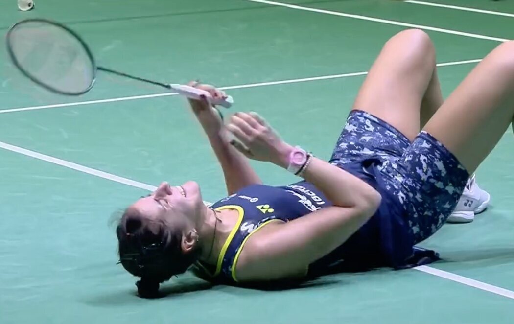 El primer juego, pese a la resistencia inicial de su rival, lo resolvió con un parcial de 11-4. La energía de Gilmour fue clave en los primeros compases del partido y se vio opacado por el dominio de Carolina Marín en defensa y ataque, dificultando enormemente el juego de su rival.