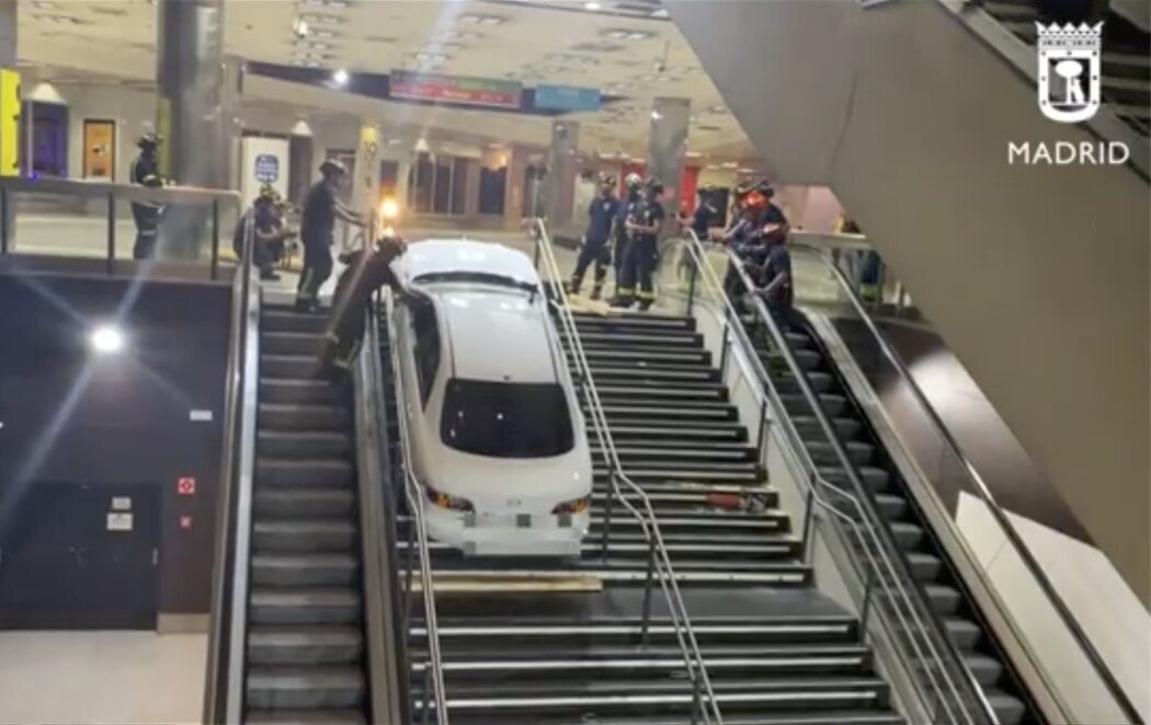 Un coche robado ha irrumpido esta medianoche en el intercambiador de Plaza Elíptica de Madrid ha quedado atrapado en las escaleras, según ha informado Emergencias Madrid. "El conductor accedió al interior desde el acceso exclusivo de autobuses de la A-42, la autovía de Toledo. Circuló y acabó entrando en le edificio a través de las puertas de cristal y ya se quedó encajado en las escaleras", explicó su portavoz.