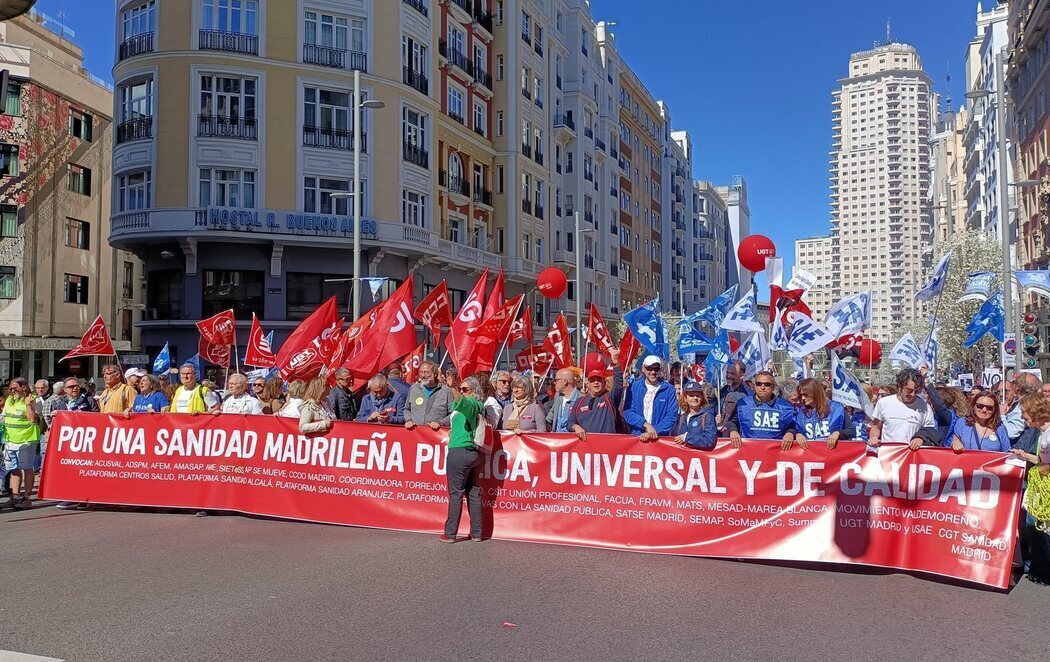 Asociaciones profesionales, vecinales, científicas, de usuarios, sindicatos y plataformas profesionales de la salud han tomado este domingo las calles del centro de Madrid "en defensa de la sanidad pública", como ya lo hicieran el 22 de octubre de 2022. Bajo el lema 'Por una sanidad madrileña pública, universal y de calidad', casi una treintena de organizaciones han llamado este domingo a la movilización a la ciudadanía madrileña.