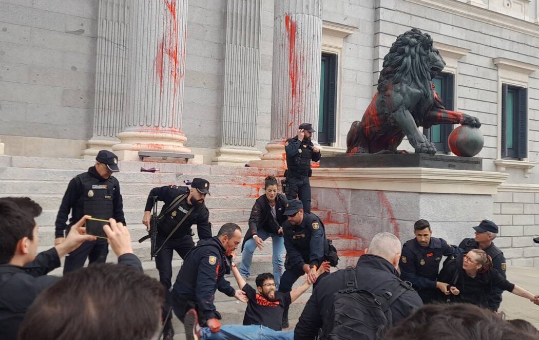 Una decena de activistas de Futuro Vegetal han lanzado pintura roja en la fachada exterior del Congreso de los Diputados y sobre los icónicos leones de la escalinata. Una acción que tiene lugar ante la declaración en los juzgados de los 15 científicos españoles imputados por la protesta similar que realizaron en abril del año pasado a las puertas del Congreso de los Diputados miembros de Rebelión Científica para denunciar la inacción climática de los políticos.