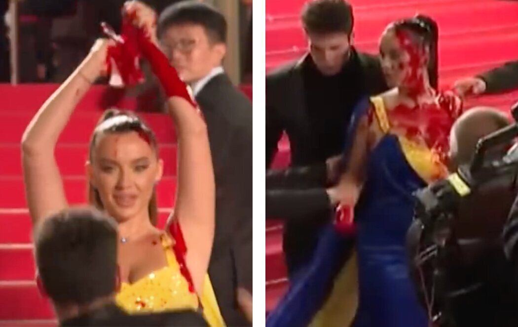 Una mujer ha utilizado el Festival de Cannes como altavoz para protestar contra la guerra en Ucrania. La mujer se encontraba desfilando por la alfombra roja del Festival vestida con los colores de la bandera de Ucrania, azul y amarillo, y se ha rociado sangre falsa por el cuerpo.