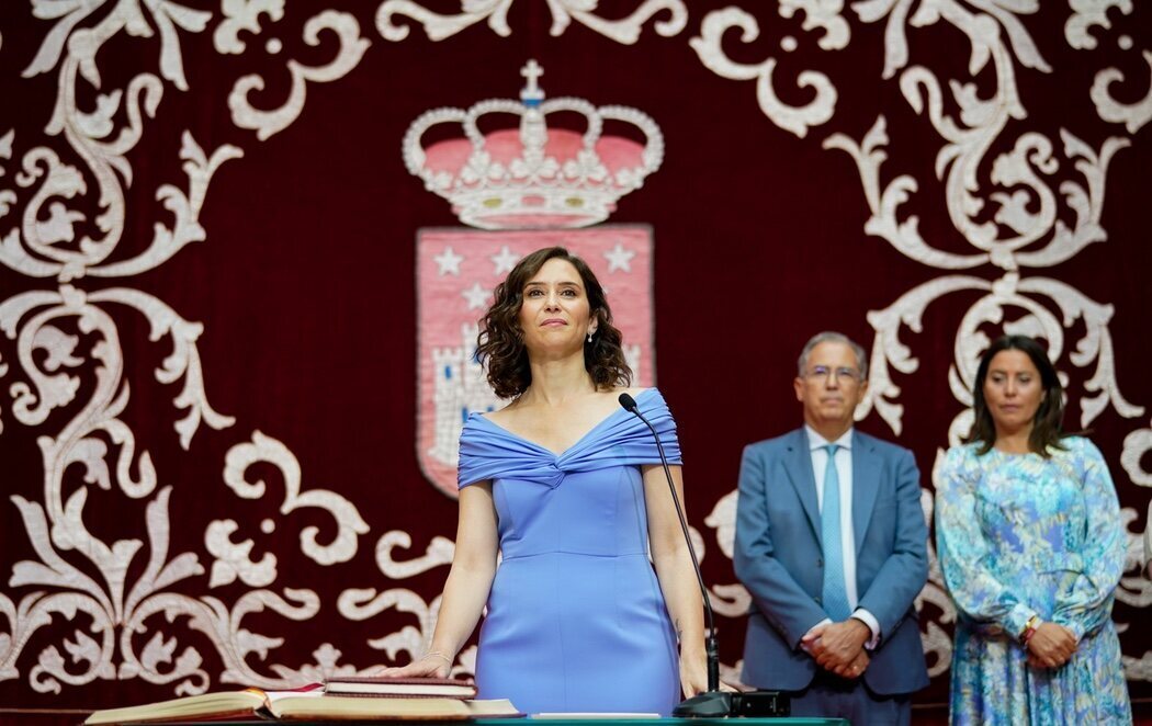En un acto en la Real Casa de Correos, junto al líder del PP, Alberto Núñez Feijóo y algunos barones de su partido, como Carlos Mazón o María Guardiola, la presidenta de la Comunidad de Madrid, Isabel Díaz Ayuso, ha revalidado su cargo al frente de la región, la tercera legislatura.