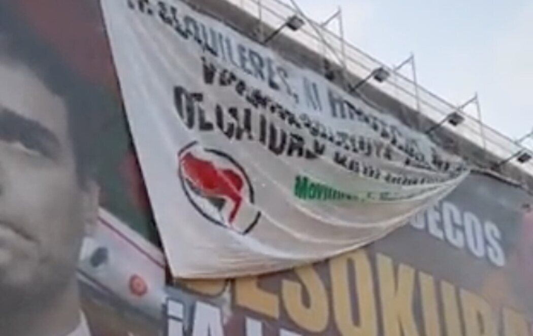 "Ni alquileres, ni hipotecas, ni deudas. Vivienda gratuita, universal, de calidad y bajo control obrero", se puede leer en la nueva lona desplegada por Movimiento de la Vivienda de Madrid, sobre el cartel de Desokupa, en el número 35 de dicha calle.