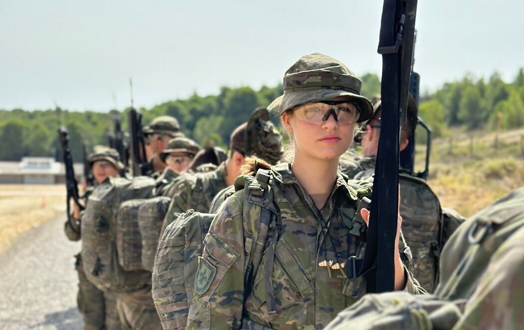 La princesa Leonor ha recibido su primer período de instrucción en la Academia General Militar de Zaragoza, en el que ha participado en sus primeras maniobras con uniforme de camuflaje, en las que aparece con casco y la cara pintada, portando fusil de asalto.