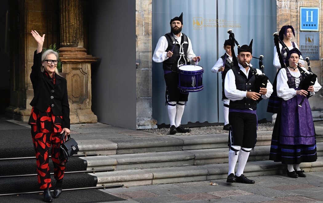 Con chaqueta negra y pantalones estampados negros y rojos, la actriz más veces nominada a los Óscar y a los Globo de Oro de la historia se ha acercado a la banda de gaitas 'El Gumial' para disfrutar de la música. En ese momento, la actriz ha sorprendido a todos cuando se ha animado a dar unos pasos de baile durante unos segundos, lo que ha arrancado la ovación de los asistentes.