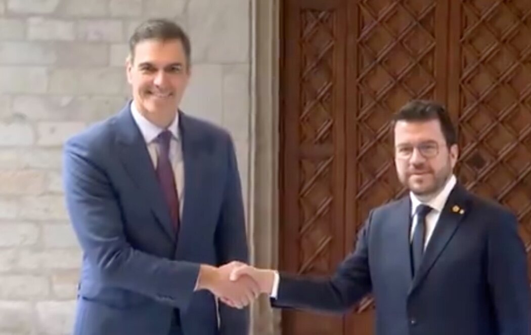 El presidente del Gobierno, Pedro Sánchez, se ha reunido con el presidente de la Generalitat de Cataluña, Pere Aragonès en el Palau de la Generalitat, en el que se ha convertido en el primer encuentro después de que sus partidos (PSOE y ERC) hayan alcanzado un acuerdo para la investidura del líder socialista.